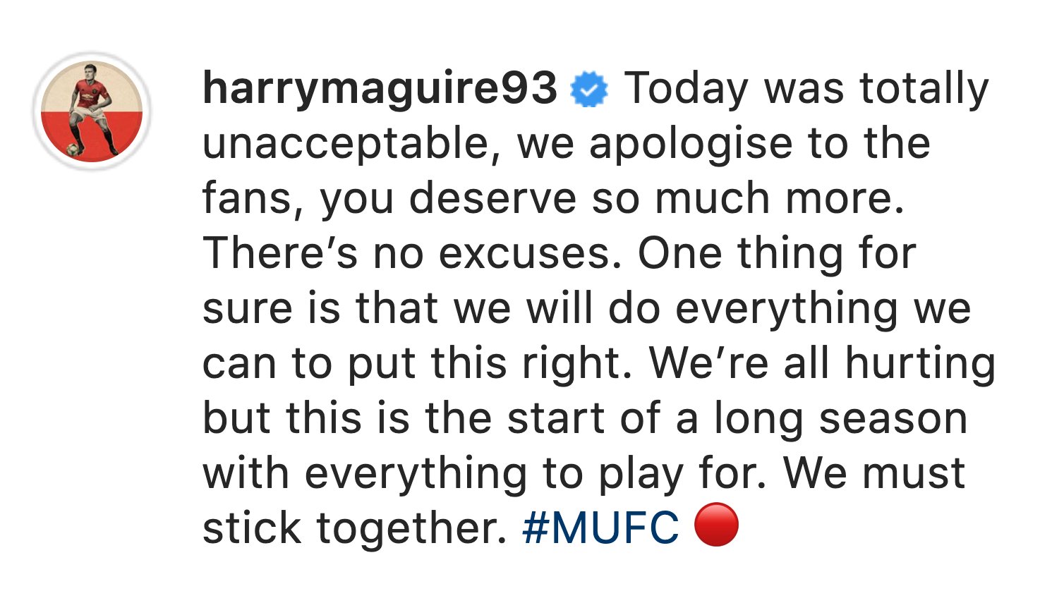 Trung vệ đội trưởng Harry Maguire, người có nhiều sai lầm dẫn đến bàn thua trong trận này cũng nhanh chóng lên tiếng xin lỗi các CĐV trên trang cá nhân của mình: "Kết quả hôm nay thật sự rất tồi tệ và tôi không có gì để bào chữa cho những lỗi lầm của mình. Tôi xin lỗi các CĐV MU, các bạn xứng đáng nhận được những kết quả tốt hơn. Chúng tôi cần đoàn kết lại và sẽ cố gắng trở lại trong những trận sắp tới".