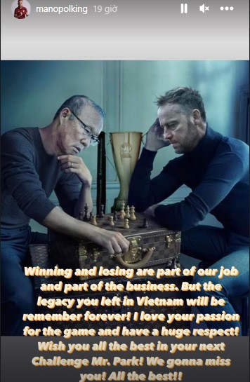 “Thắng thua là một phần trong công việc của chúng ta, trong môn thể thao Vua này . Nhưng di sản của ông để lại cùng ĐT Việt Nam sẽ trường tồn. Tôi yêu và ngưỡng mộ niềm đam mê bóng đá của ông”, thuyền trưởng tuyển Thái Lan, Mano Polking dành sự tôn trọng lớn cho HLV Park Hang Seo, thông qua trang cá nhân của mình.