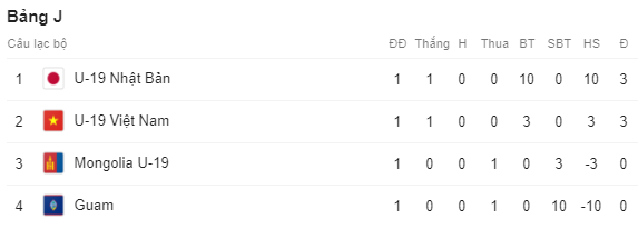 Sau lượt trận đầu tiên của bảng J, U19 Việt Nam xếp thứ 2 cùng 3 điểm như U19 Nhật Bản nhưng thua về hiệu số phụ (+3 so với +10). Vào lúc 19h00 ngày mai 8/11, U19 Việt Nam sẽ đá trận thứ 2 gặp U19 Guam.