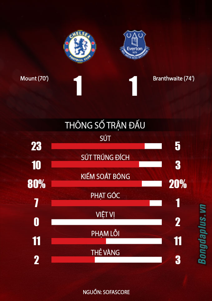 Tất nhiên, với đội hình được đánh giá vượt trội, Chelsea nhanh chóng chiếm lĩnh thế trận, liên tục đẩy cao đội hình và bắn phá khung thành thủ môn Jordan Pickford. Trong 45 phút đầu tiên của trận đấu, The Blues nắm giữ quyền kiểm soát bóng luôn trên ngưỡng 70%, thực hiện rất nhiều những tình huống dứt điểm và theo thống kê, thủ môn Pickford đã có 6 pha cứu thua để giúp Everton bước vào giờ nghỉ với kết quả hòa không bàn thắng.