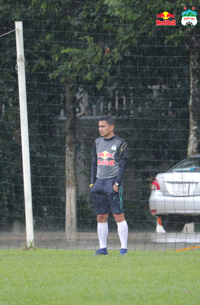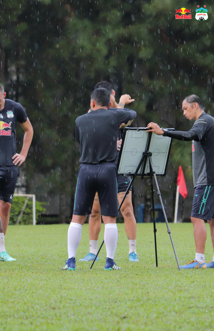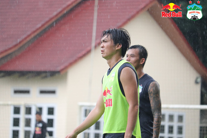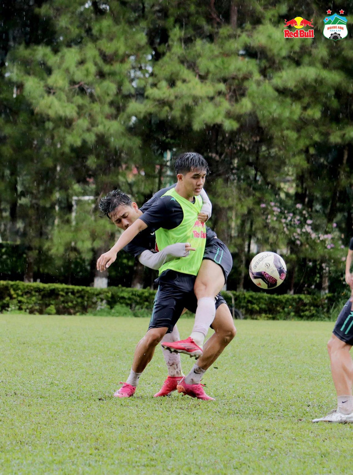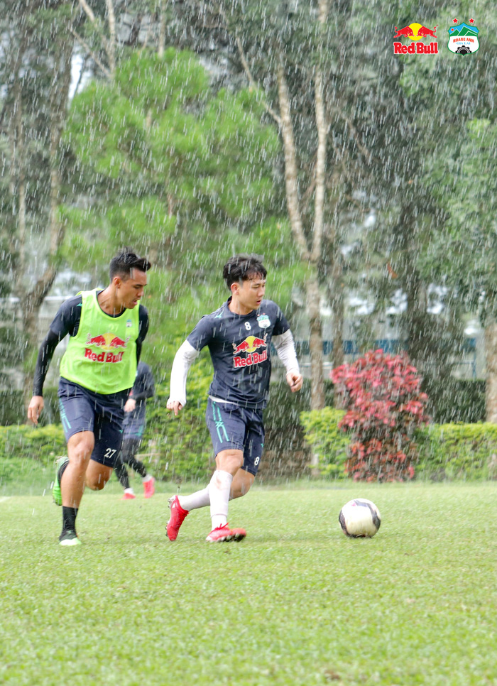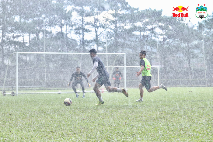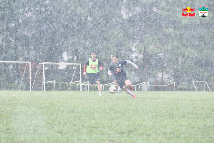 CLB Hoàng Anh Gia Lai chia đội thi đấu nội bộ giữa trời mưa lớn, Công Phượng dẫn đầu nhóm áo bib giành chiến thắng với tỉ số 4-2.