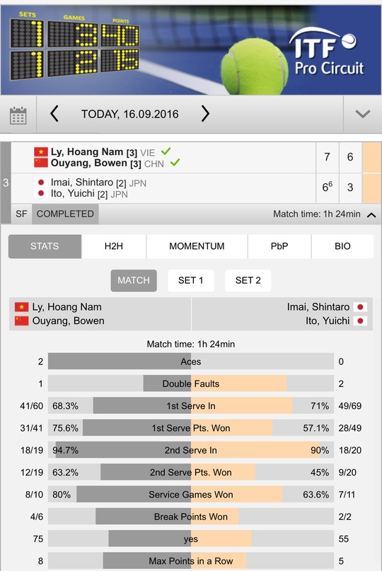 Thắng nghẹt thở đôi hạt giống số 2 Nhật Bản Imai Shitaro - Ito Yuichi vào chiều tối 16-9, cặp Lý Hoàng Nam - Ouyang Bowen (Trung Quốc) vào chung kết giải Vietnam F4 Futures 2016, diễn ra vào chiều 17-9 tại Bình Dương.