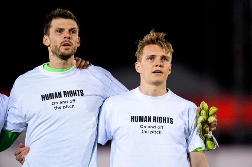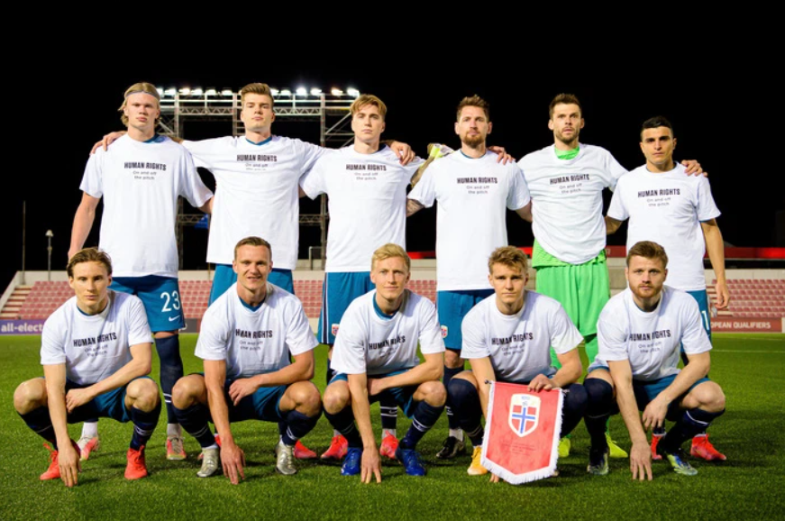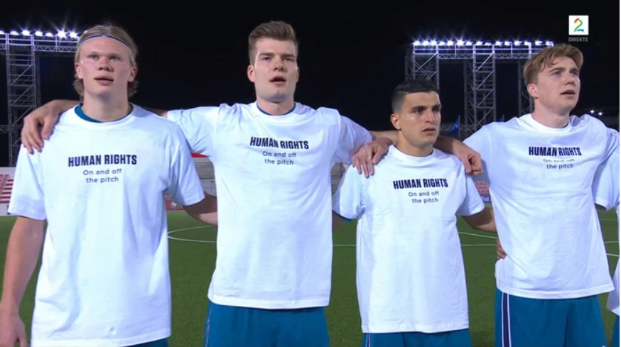 Trong trận mở màn vòng loại World Cup 2022 với Gibraltar, các cầu thủ Na Uy mặc áo phát đi thông điệp phản đối vấn đề nhân quyền ở nước chủ nhà Qatar.