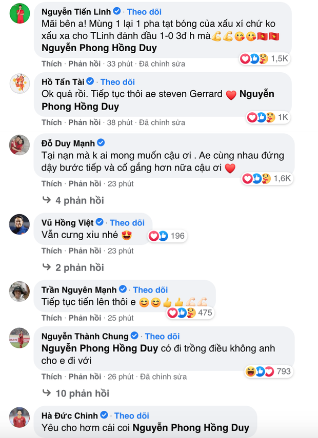 Phía dưới bài đăng, ngoài sự động viên của người hâm mộ, dàn cầu thủ ĐT Việt Nam đã nhanh chóng để lại nhiều bình luận khác nhau. Nếu như Nguyên Mạnh và Duy Mạnh động viên chân thành thì Tiến Linh, Thành Chung, Hà Đức Chinh lại trêu đùa nhiệt tình.