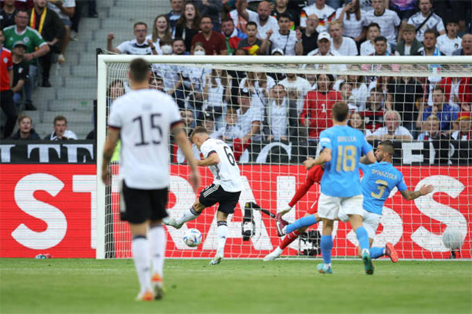 Với lợi thế được chơi trên sân nhà, Đức đã nhập cuộc đầy hứng khởi. Sau 10 phút bóng lăn, họ đã khai thông được thế bế tắc từ một pha dàn xếp tấn công bài bản. Đón quả tạt chất lượng của hậu vệ Raum, tiền vệ Kimmich đã băng lên dứt điểm gọn gàng bằng chân trái buộc thủ môn Donnarumma phải vào lưới nhặt bóng.