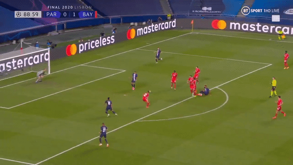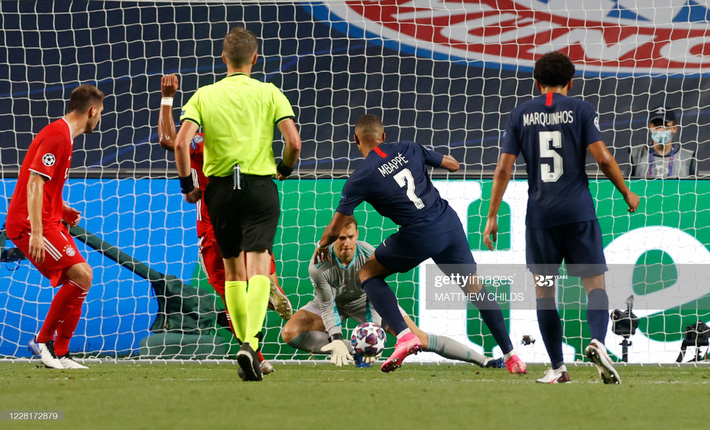 Phút 90 của trận chung kết Champions League 2019/20, Mbappe có bóng sau nỗ lực dứt điểm không thành từ đồng đội. Ở vị trí đối mặt với thủ môn, cách khung thành khoảng 6 mét và không bị ai kèm, tiền đạo người Pháp vẫn chẳng thể thắng nổi thủ môn Neuer.