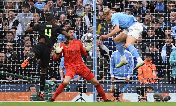 Ở chiều ngược lại, Man City phòng ngự đầy chủ động và tung những đòn phản công đầy chất lượng. Phút 74, Haaland đột phá dũng mãnh để đối mặt Courtois. Tuy nhiên, cú sút của anh lại chạm thủ môn rồi đi trúng xà.