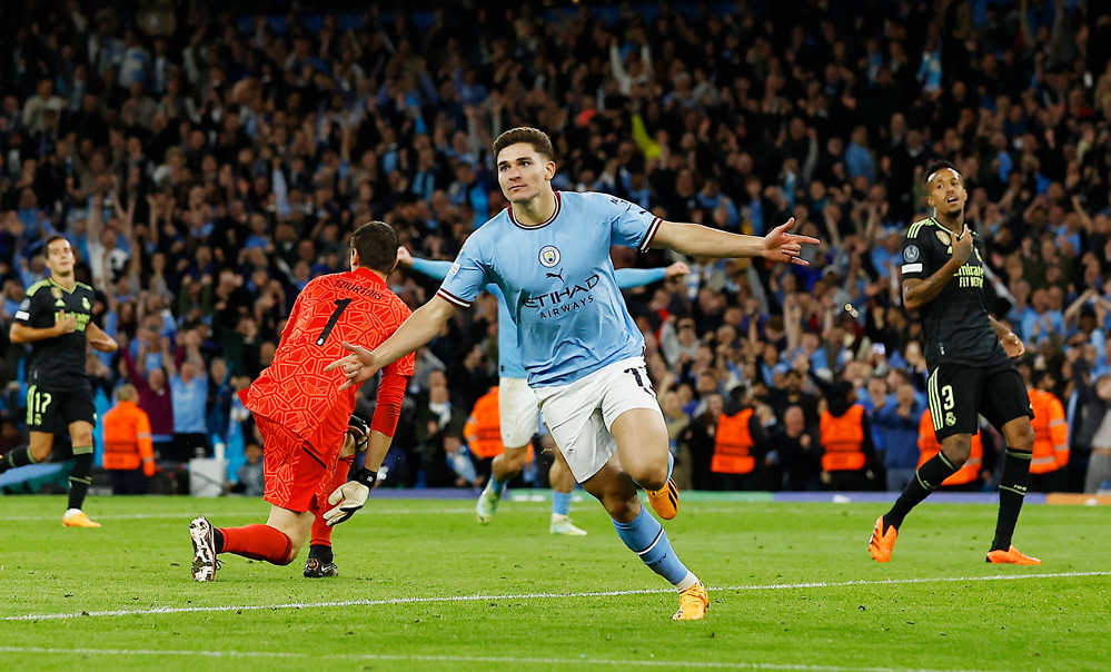 Man city: Bernardo Silva 23', 37'; Eder Militao 76'(OG); Alvarez 90'+1