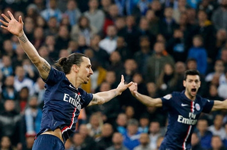 | Ibrahimovic (trái) và Pastore vui mừng khi PSG ghi bàn vào lưới Marseille - Ảnh: Reuters |