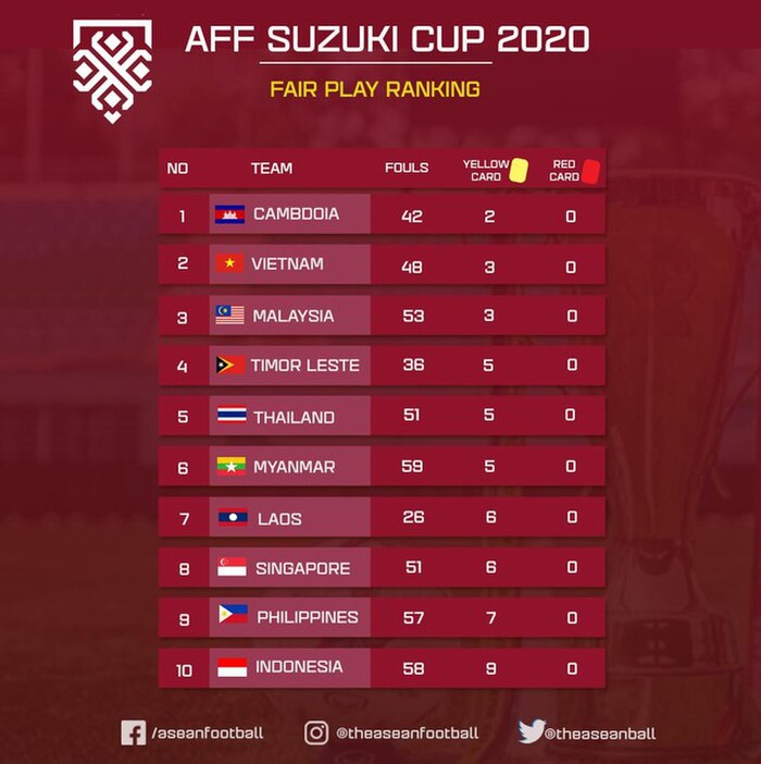 Theo tiêu chí của BTC khi đánh giá dựa trên số thẻ phạt và số lần phạm lỗi, Campuchia là đội "chơi đẹp" nhất trong khi tuyển Việt Nam đứng thứ hai trong bảng xếp hạng này. Tính từ đầu giải, đoàn quân của HLV Park Hang Seo chỉ có 48 lần phạm lỗi, nhiều hơn một chút so với Campuchia (42). Sau 4 trận các cầu thủ của chúng ta cũng mới phải nhận 3 thẻ vàng.