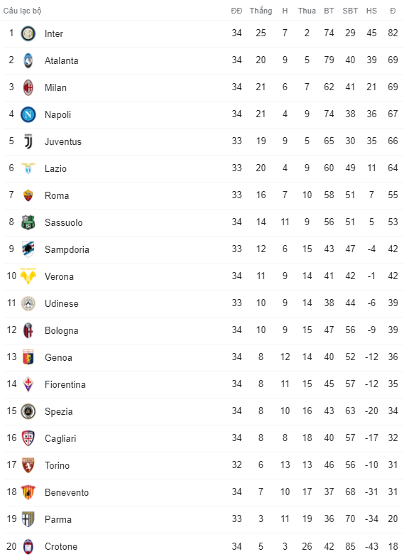 Bị cầm hòa trên sân khách, Atalanta chỉ có 69 điểm sau 34 vòng, kém Inter Milan 13 điểm. Với việc mùa giải chỉ còn 4 vòng với tối đã 12 điểm, Inter Milan đã chính thức trở thành nhà vô địch Serie A sau 11 năm chờ đợi.