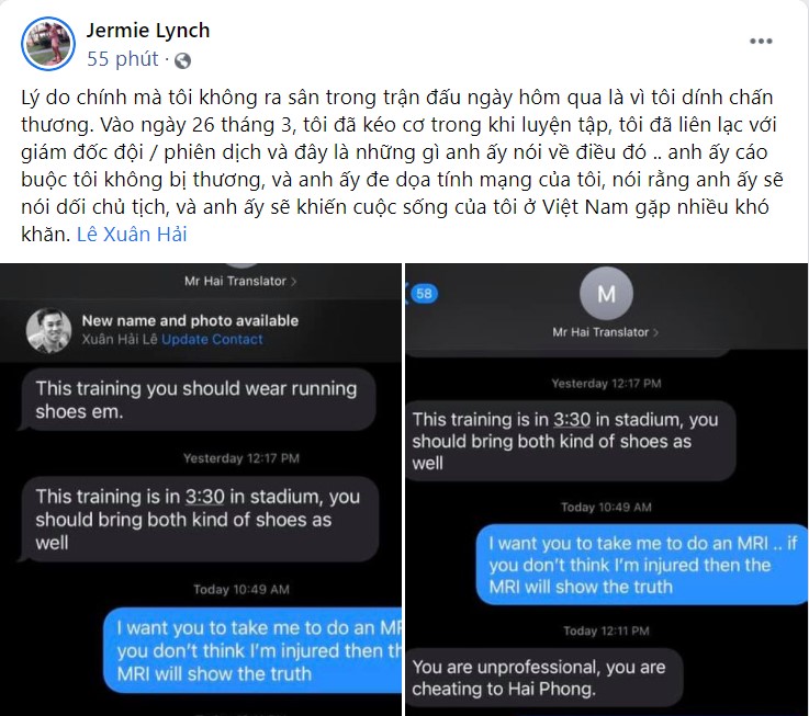 "Lý do chính mà tôi không ra sân trong trận đấu ngày hôm qua là vì tôi dính chấn thương. Vào ngày 26 tháng 3, tôi đã kéo cơ trong khi luyện tập, tôi đã liên lạc với giám đốc đội / phiên dịch và đây là những gì anh ấy nói về điều đó, anh ấy cáo buộc tôi không bị thương, và anh ấy đe dọa tính mạng của tôi, nói rằng anh ấy sẽ nói dối chủ tịch, và anh ấy sẽ khiến cuộc sống của tôi ở Việt Nam gặp nhiều khó khăn". Jermie Lynch chia sẻ.