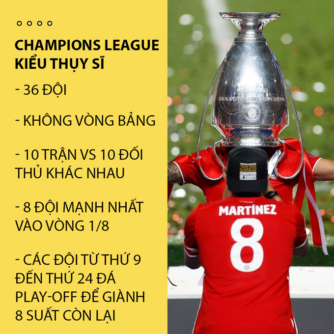 "Hệ thống Thụy Sỹ" là giải pháp nhằm giúp các CLB hàng đầu tích lũy nhiều doanh thu hơn nữa và thoải mái hơn. Ở vòng bảng năm nay, Real Madrid ít nhất đã phải chịu một chút áp lực khi để thua Shakhtar và sau đó là trận hòa trước Monchengladbach. Cuối cùng họ vẫn đứng đầu bảng nhưng chịu nhiều hoài nghi trong 4 trận còn lại. Nếu thi đấu 10 trận như thể thức mới, họ sẽ có rất ít cảm giác nguy hiểm.