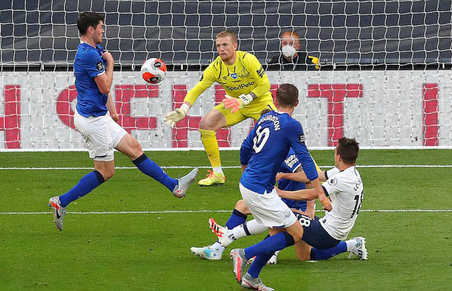 Phút 24, từ tình huống lộn xộn trong vòng cấm, Lo Celso sút bóng chạm người Michael Keane đổi hướng làm bó tay thủ thành Pickford. 1-0 cho Tottenham đầy may mắn.