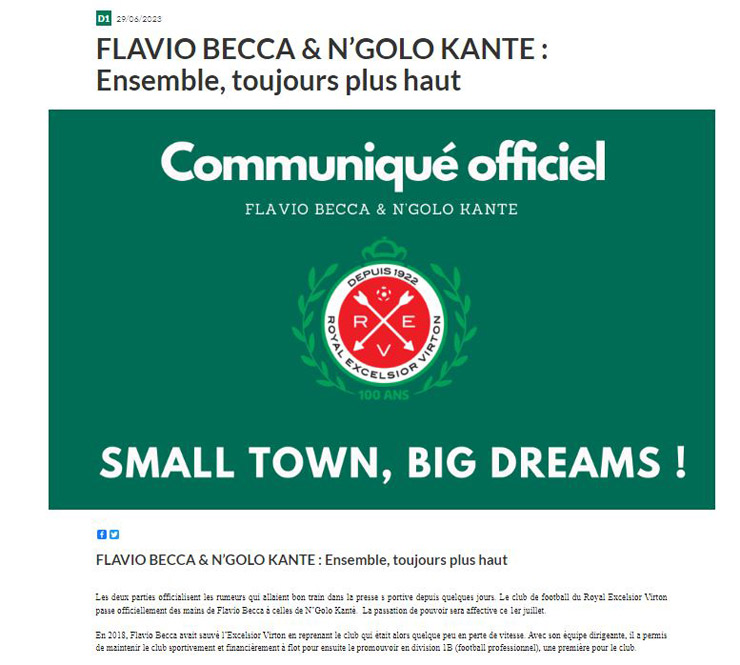 Trang chủ của Royal Excelsior Virton tiếp tục ca ngợi về Kante: “Flavio (Becca) rõ ràng vô cùng hạnh phúc khi trao CLB lại cho N’Golo Kante, một cầu thủ đẳng cấp, không chỉ vì phẩm chất bóng đá mà trên hết là phẩm chất con người của anh ấy đã được mọi người công nhận. Flavio để lại một CLB có tình hình tài chính tốt khi không còn nợ nần. Một ban giám đốc mới sẽ được thành lập trong những ngày tới”.