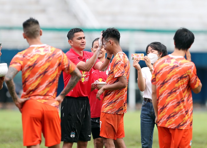 Kết thúc buổi tập trên sân Quân khu 7, cựu tiền đạo này đã tổ chức các nghi thức như bôi vôi lên mặt cho các thành viên trong đội, té nước… như một cách để nhớ về truyền thống quê hương đất nước, đồng thời, giới thiệu nét văn hóa đặc sắc của xứ sở Chùa vàng cho các thành viên của đội bóng phố núi.