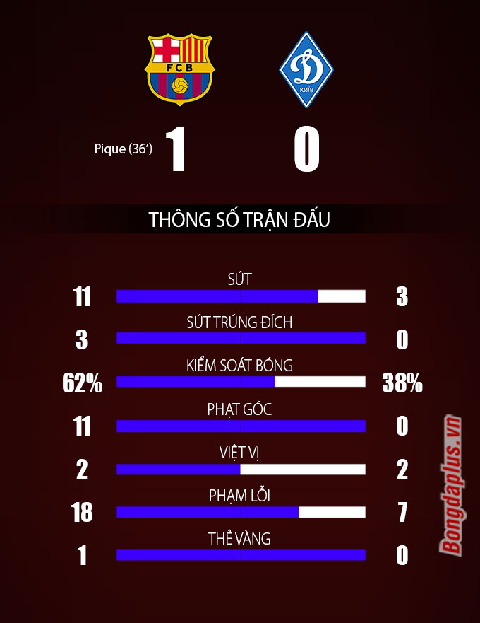 Với việc Barca đã áp đảo hoàn toàn đối phương, không ngạc nhiên khi đến phút 36, họ khai thông được thế bế tắc của trận đấu. Xuất phát từ quả tạt rất có ý đồ của Alba, trung vệ Pique đã khôn khéo phá bẫy việt vị trước khi băng vào đệm bóng làm tung nóc lưới đội khách.