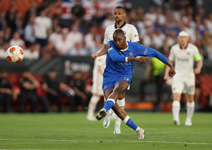 Với Rangers, đoàn quân HLV Van Bronckhorst phải chờ tới phút 25 mới có được tình huống dứt điểm đầu tiên với pha xoay sở và cứa lòng kỹ thuật của tiền đạo Aribo nhưng bóng đi chệch cột dọc trong gang tấc. Ngoài ra, đại diện Scotland cũng có được một cơ hội ngon ăn khác ở phút 37, nhưng cú đánh đầu ở khoảng cách 6m của John Lundstram không thắng được thủ thành Kevin Trapp.