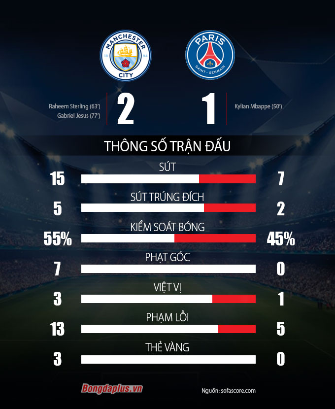 Và đội khách đã phải trả giá. Phút 63, Rodri thực hiện đường chuyền thông minh để Walker băng xuống căng ngang vào trong. Jesus không thể chạm bóng trước sự theo kèm của 2 hậu vệ PSG. Tuy nhiên Sterling đã kịp băng vào đệm bóng cận thành trong tư thế không bị ai kèm.