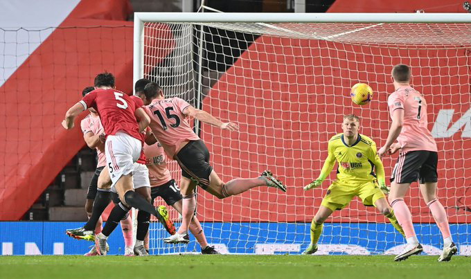 Từ quả đá phạt góc như đặt của Bruno Fernandes, trung vệ đội trường Harry Maguire trong lần lên tham gia tấn công đã băng cắt dũng mãnh đánh đầu tung lưới Sheffield, gỡ hòa 1-1.