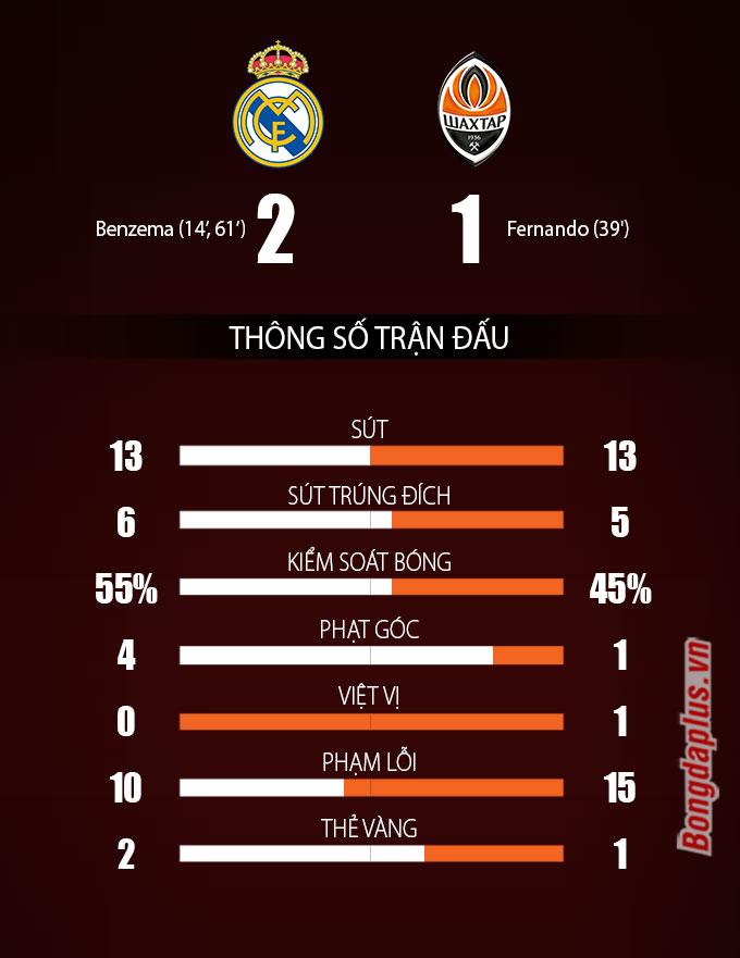 Sau màn vùi dập Shakhtar 5-0 ở lượt đi, Real có lý do đề kỳ vọng họ có thể làm được điều tương tự trong màn tái đấu. Niềm tin của Real càng được củng cố khi cột dọc cứu thua cho "Kền kền trắng" sau cú đá từ ngoài vòng cấm của Alan Patrick (9'). Ngay sau đó tiền đạo Karim Benzema được mở tỷ số cho đội chủ nhà.