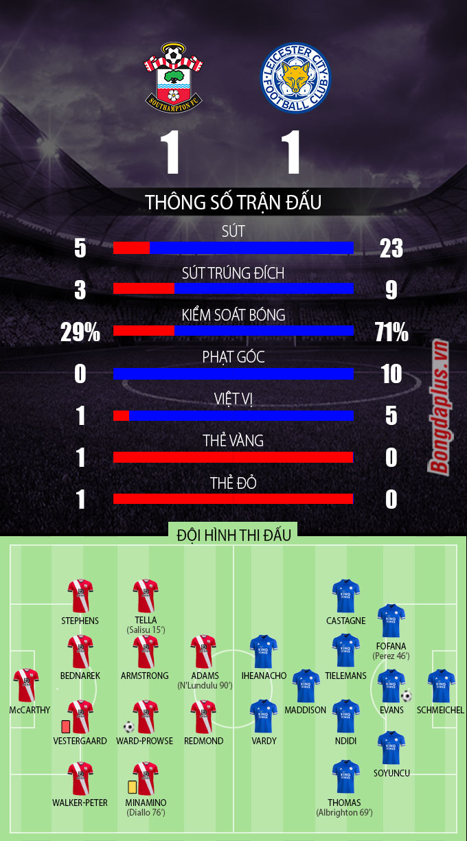 Pha lập công này giúp Leicester tháo gỡ vấn đề mặt tâm lý để tiếp tục dồn ép Southampton. Tuy nhiên, tất cả áp lực mà Bầy cáo tạo ra chỉ dừng lại ở mức cơ hội. Kết thúc 90 phút, Leicester tung ra cả thảy 23 cú sút, cầm bóng 71% song chỉ thu về trận hòa 1-1 thất vọng bất chấp chơi hơn người trong phần lớn thời gian.