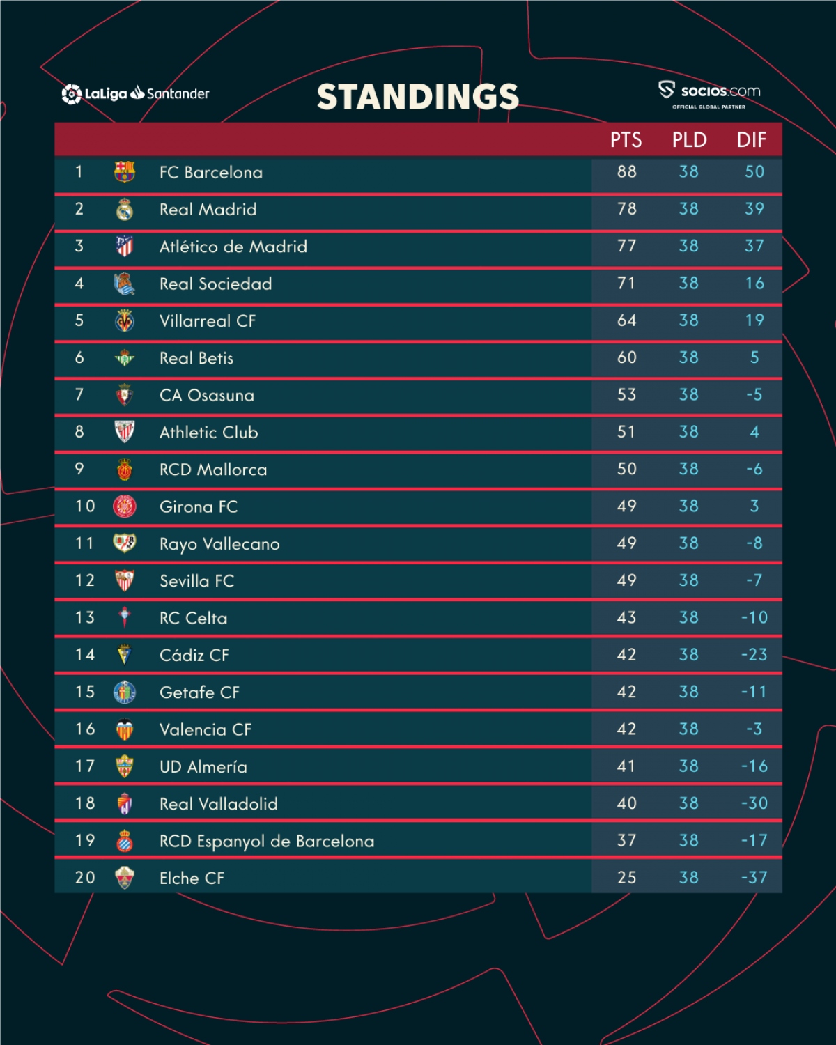 Vào đêm 4/6 và rạng 5/6 (giờ Việt Nam) đã diễn ra các trận đấu của vòng 38 - vòng đấu cuối cùng của La Liga 2022/23.