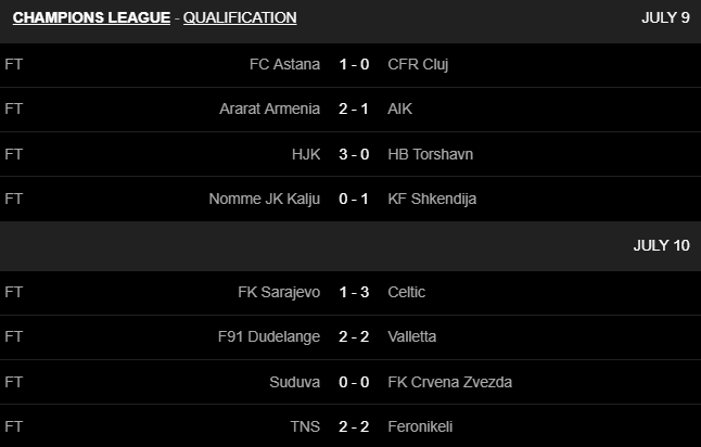 Ở một số trận đấu đáng chú ý khác, CLB Cluj của Romania bất ngờ để thua 0-1 trên sân của Astana. Trong khi đó, dù phải đá thiếu người do Faith Friday Obilor phải nhận thẻ đỏ ở phút 31, đại diện Phần Lan HJK Helsinki vẫn đè bẹp HB Torshavn 3 bàn không gỡ.