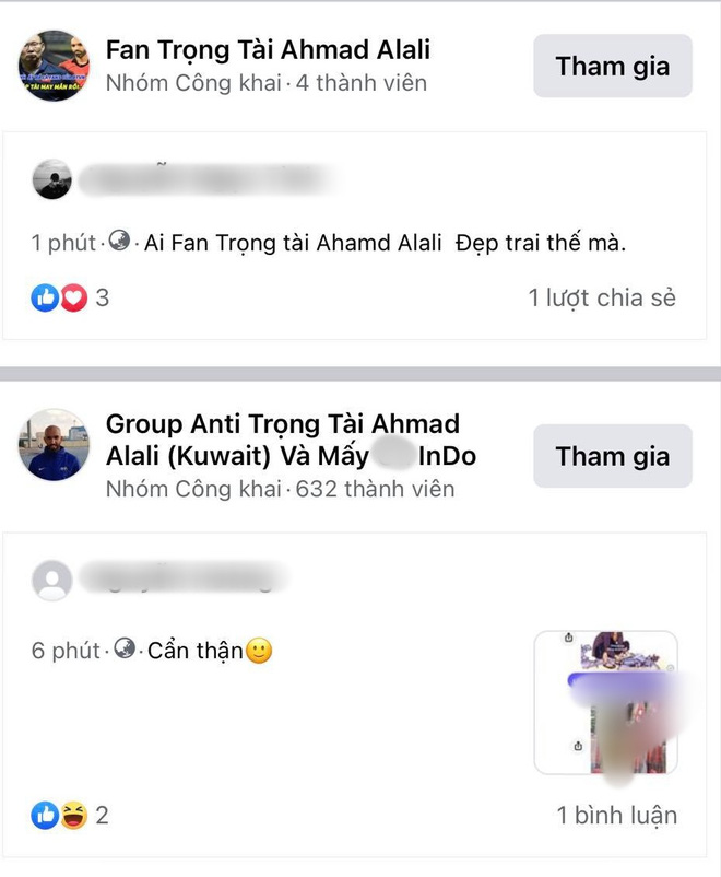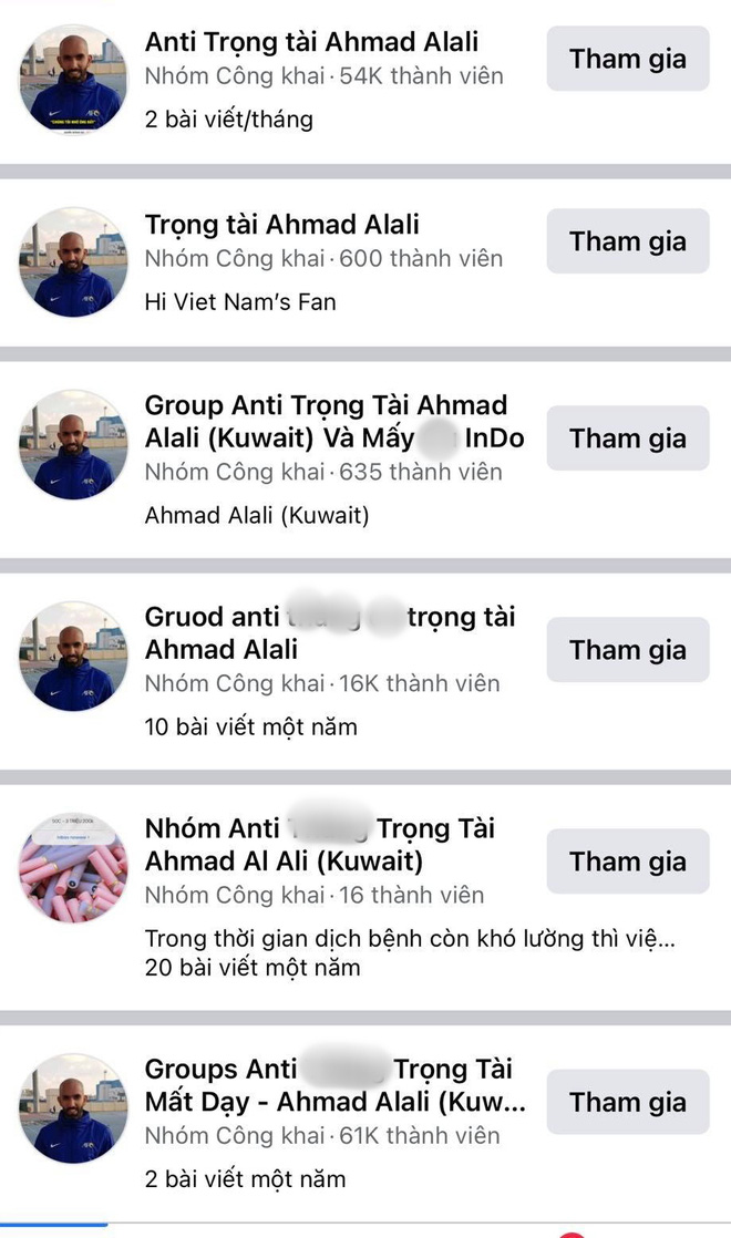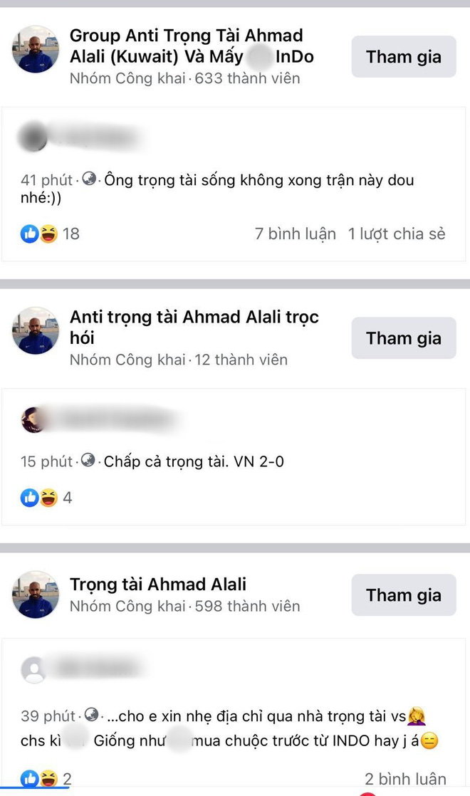 Theo đó, chỉ sau một trận đấu mà các group như: "Group anti trọng tài Ahmad Alali (Kuwait) và Indo" hay "Nhóm anti trọng tài Ahmad Al Ali) hoặc "Anti trọng tài Ahmad Alali" xuất hiện nhiều.