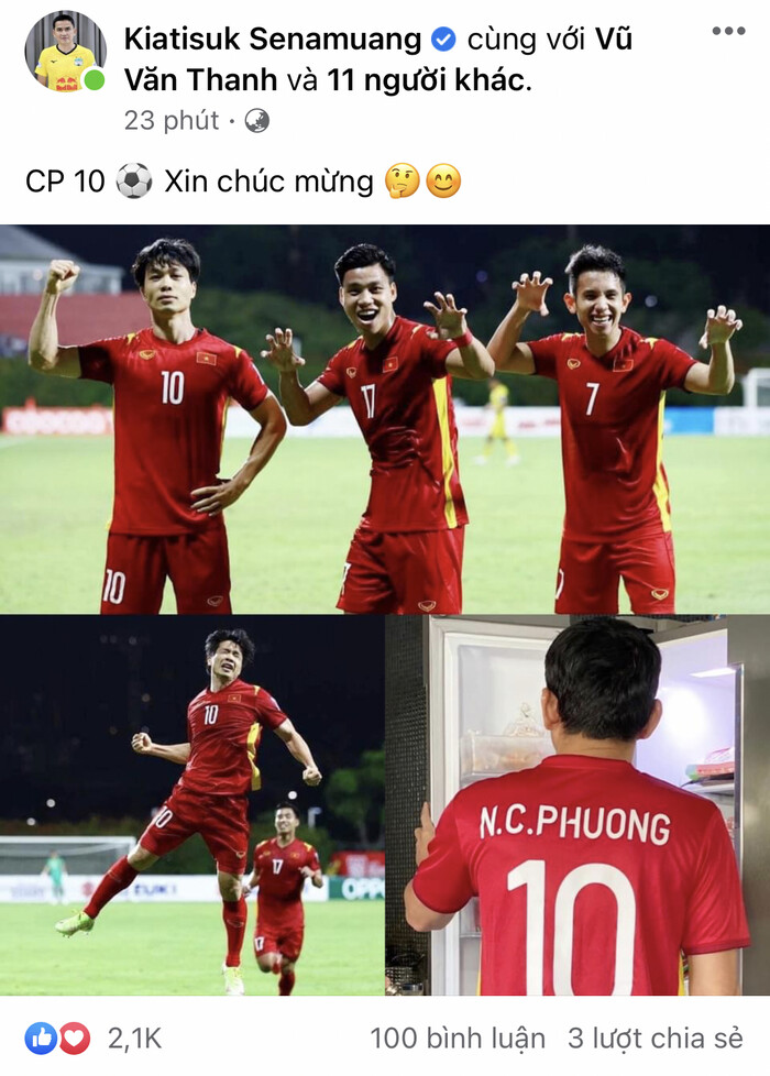 Ngay sau chiến thắng 3-0 của ĐT Việt Nam trước Malaysia, HLV Kiatisak đã có động thái đáng chú ý. Trên trang cá nhân của mình, chiến lược gia người Thái chia sẻ hình ảnh mặc áo tuyển Việt Nam. Đó là số áo của Công Phượng (số 10).