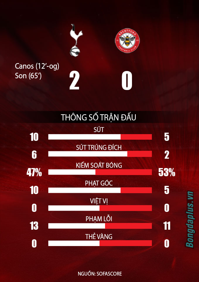 Phút 12, Son Heung Min tạt bóng từ cánh trái vào vòng cấm của Brentford. Cầu thủ Pontus Jansson đã vô tình đánh đầu trúng vào đầu của đồng đội Sergi Canos và biến cầu thủ người Tây Ban Nha thành người đá phản lưới nhà, qua đó giúp Tottenham may mắn vượt lên dẫn 1-0.