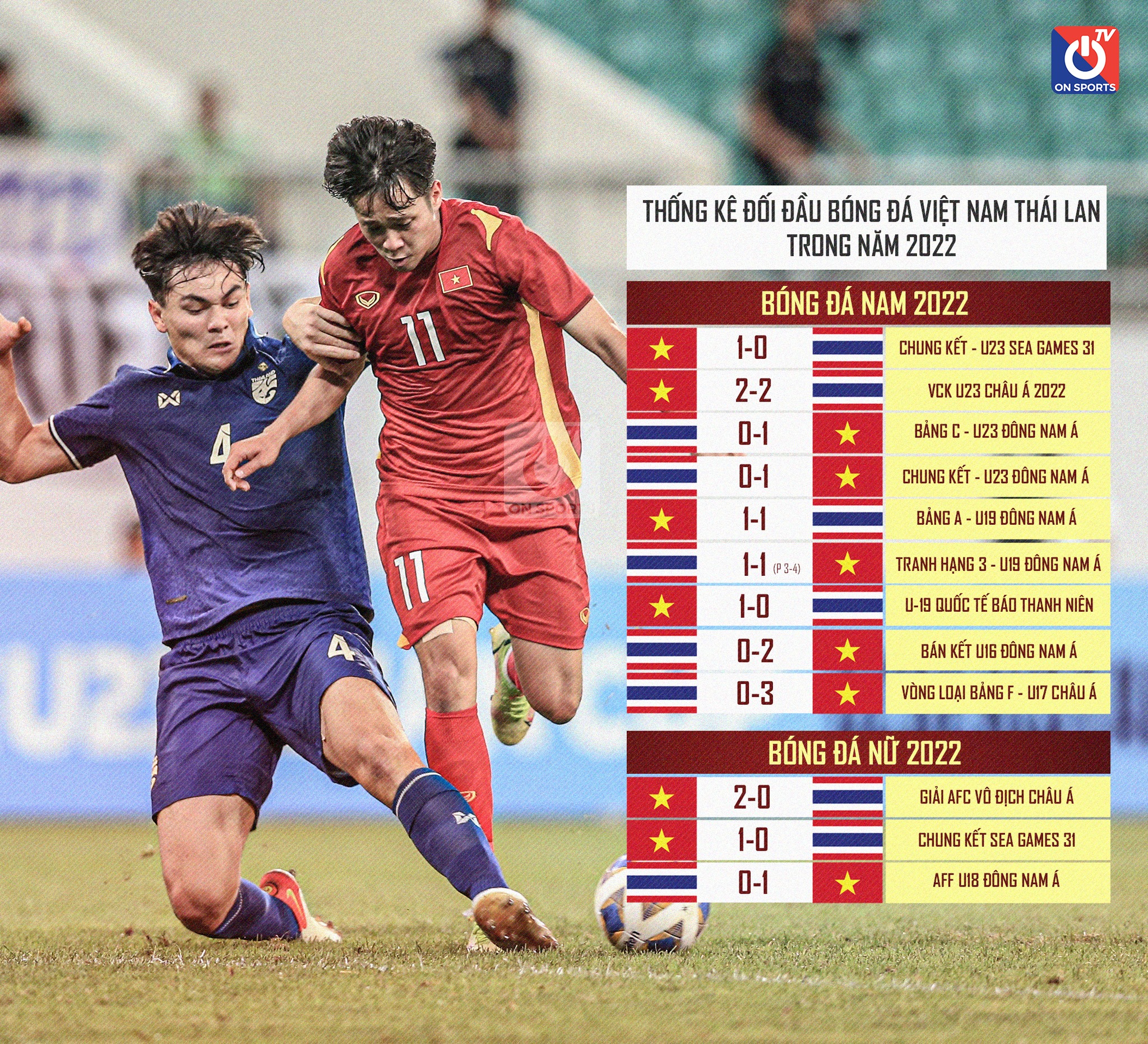 Đầu tháng 8, U16 Việt Nam đã thắng thuyết phục U16 Thái Lan 2-0 trong trận bán kết giải U16 Đông Nam Á 2022. Công Phương và Trọng Tuấn là những người đã ghi bàn đưa U16 Việt Nam vào chung kết. Mới nhất, U17 Thái Lan lại thảm bại 0-3 trước Việt Nam ở vòng loại U17 châu Á 2023.