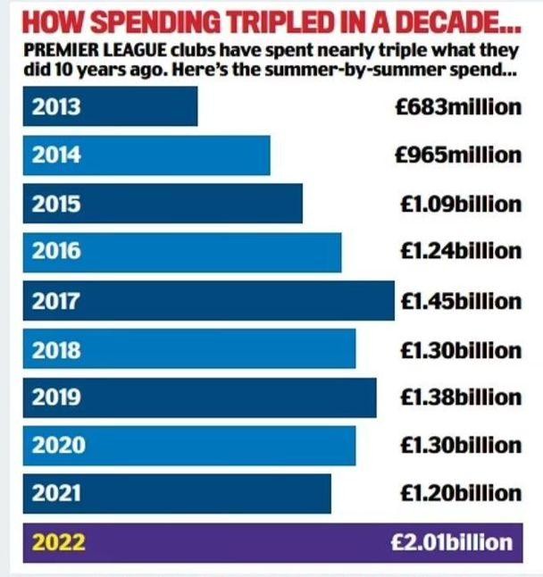 Theo tính toán, đội vô địch Premier League mùa 2022/23 sẽ bỏ túi ít nhất 180 triệu bảng, còn đội xếp cuối, dù xuống hạng, vẫn được đảm bảo nhận về hơn 100 triệu bảng. Cộng thêm các nguồn thu nhập từ các giải khác, vé vào sân, áo đấu và các dịch vụ giá trị gia tăng cùng những hợp đồng thương mại khác, số tiền chi cho chuyển nhượng chỉ chiếm khoảng 33% doanh thu.