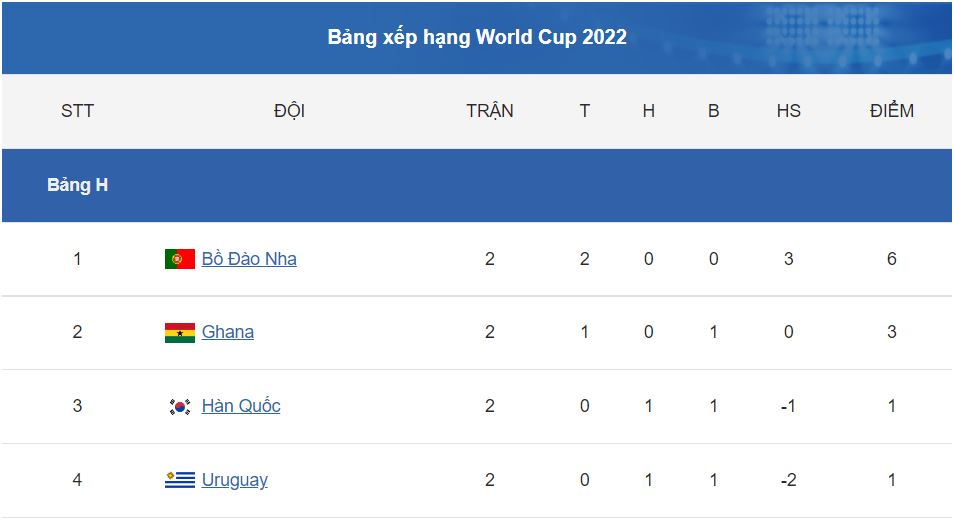 Theo lịch, lượt trận cuối cùng bảng H giữa Hàn Quốc vs Bồ Đào Nha, Uruguay vs Ghana sẽ cùng diễn ra vào lúc 22h00 hôm nay 2/12 (giờ Việt Nam).