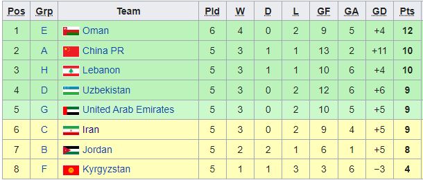Do Triều Tiên bỏ giải, dẫn đến bảng H chỉ còn 4 đội, nên ở cuộc đua này kết quả giữa đội nhì các bảng với đội đứng thứ 5 sẽ không được tính đến. Như thế chúng ta sẽ bị trừ đi 6 điểm ở hai trận gặp Indonesia, và sẽ chỉ còn 11 điểm.