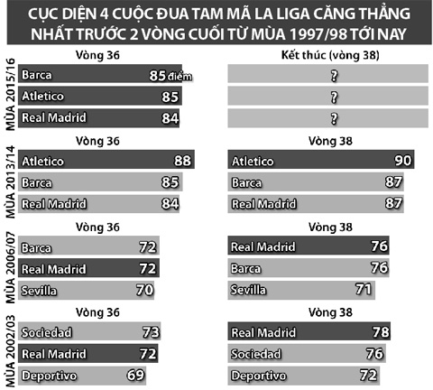 Sau 32 năm, cuộc đua vô địch khốc liệt La Liga mà đời người chỉ được vài lần chứng kiến đã tái hiện. Mùa giải này mới là lần đầu tiên kể từ năm 1984 đến nay, khoảng cách giữa 3 đội dẫn đầu La Liga trước 2 vòng cuối tối đa chỉ là 1 điểm. Suốt lịch sử La Liga cũng chỉ có tổng cộng 7 trường hợp như vậy.