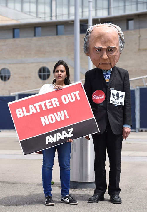| Trong khi cuộc họp của Đại hội đồng FIFA đang diễn ra (ngày 28 và 29-5) thì ngay tại Zurich, người ta biểu tình đòi Blatter từ chức - Ảnh: DPA |