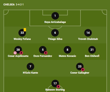 Đêm qua, Lampard đưa ra sân sơ đồ chiến thuật 3-4-2-1, nhưng thực tế có nhiều lựa chọn cực kì khó hiểu. Azpilicueta và Chilwell đá cánh nhưng phòng ngự nhiều hơn tấn công, cho nên sơ đồ được thực tế là 5-3-2, với Kante là máy quét ở giữa. Hàng công chỉ có 2 người là Conor Gallagher và Raheem Sterling. Đáng chú ý, Sterling là cầu thủ chạy cánh, còn Gallagher là tiền vệ tấn công. Như vậy, Chelsea đá 5 hậu vệ và không có tiền đạo nào.