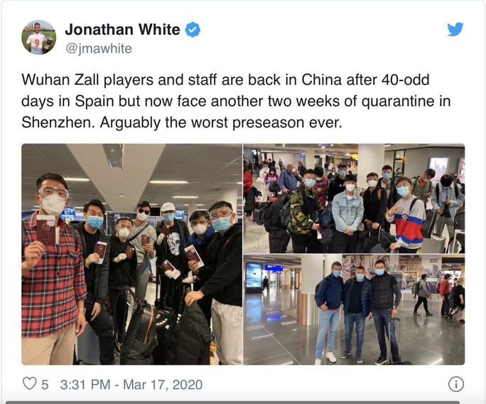 Do lệnh phong tỏa tại Vũ Hán được dỡ bỏ, hôm 18-4, đội bóng Wuhan Zall đã có thể trở về quê nhà sau chuyến tập huấn khủng khiếp tưởng "có đi, không hẹn ngày trở về". Bất chấp tình hình chưa phải đã ổn định sau dịch bệnh, đông đảo CĐV và người thân vẫn ra tận sân bay chào đón các cầu thủ hồi hương. Thủ quân Yao Hanlin đã chia sẻ tình cảnh khó khăn của đội bóng trong thời gian qua và hy vọng mọi việc sẽ ổn định trở lại, nhất là Chinese Super League 2020 có thể khai mạc ngay trong tháng 5 tới đây.