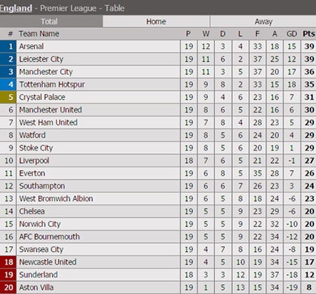 Chia điểm với Man City, Leicester City có 39 điểm sau 19 vòng đấu. “Bầy cáo” bằng điểm với Arsenal, nhưng nhìn “pháo thủ” giành chức vô địch Premier League 2015/2016 do thua chỉ số phụ.