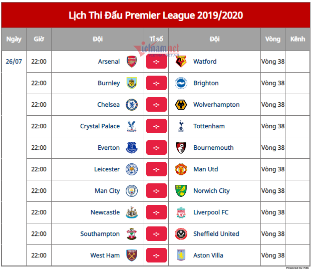 26/07/2020 16:00Leicester vs MU: Trận chiến 'sinh tử' tranh vé C1