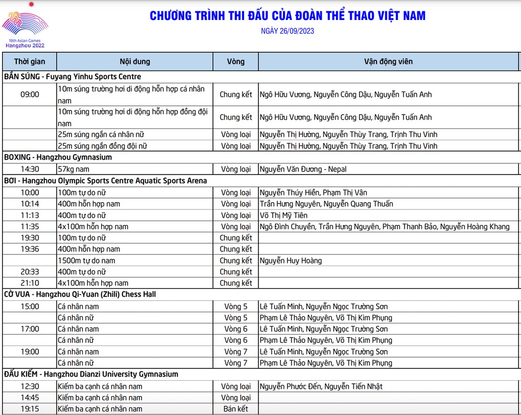 26/09/2023 15:15Lịch thi đấu Asiad 19 ngày 26/9: Kỳ vọng bắn súng 'mở hàng' HCV
