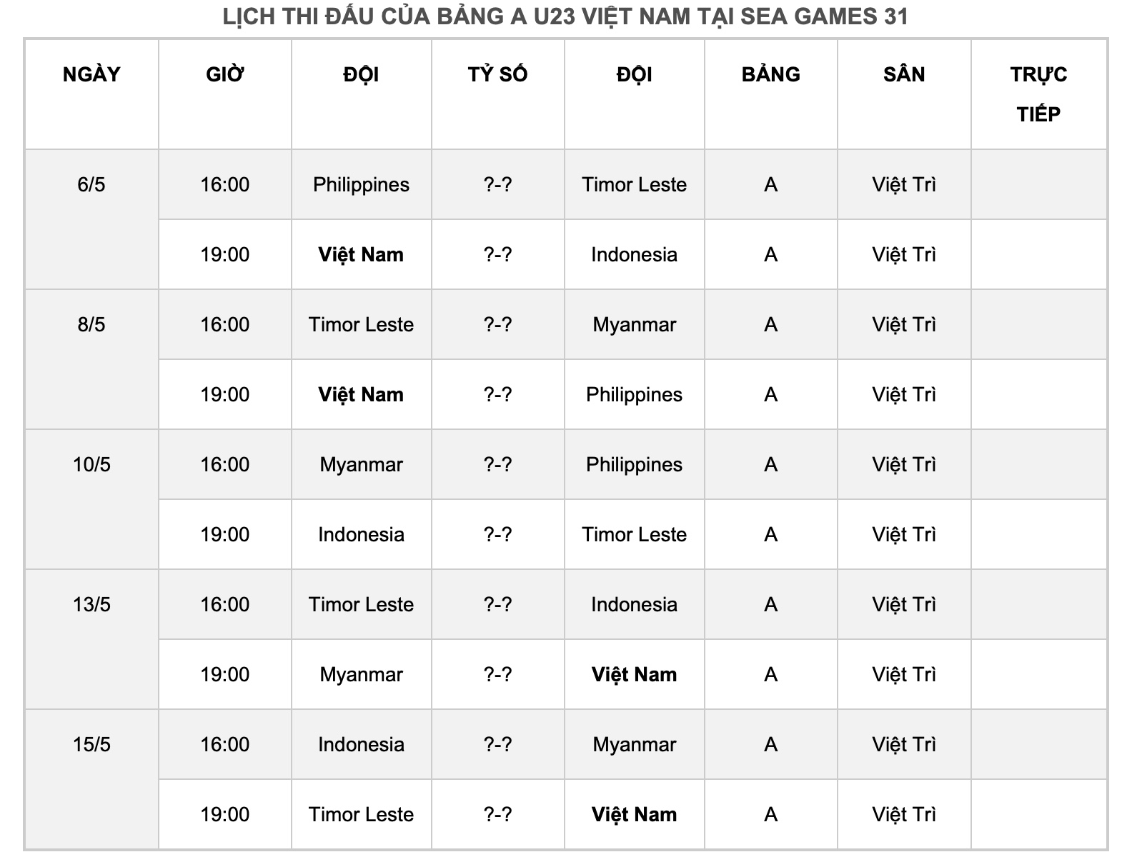 04/05/2022 20:54Lịch thi đấu của U23 Việt Nam tại SEA Games 31