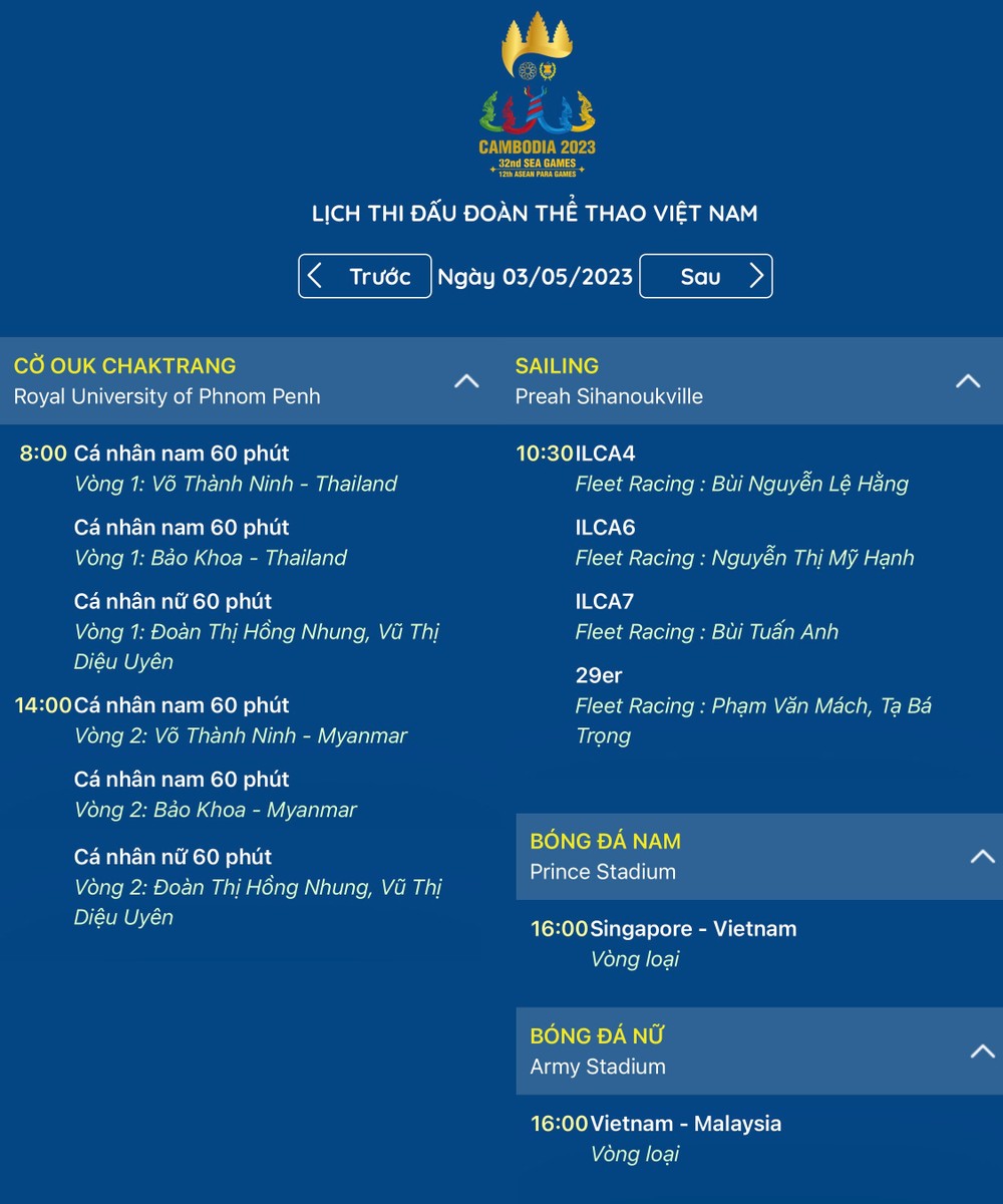 Lịch thi đấu SEA Games 32 ngày 3/5 cập nhật nhanh nhất. Thông tin các nội dung thi đấu của đoàn thể thao Việt Nam trong khuôn khổ đại hội thể thao Đông Nam Á lần đầu tiên được tổ chức tại Campuchia.
