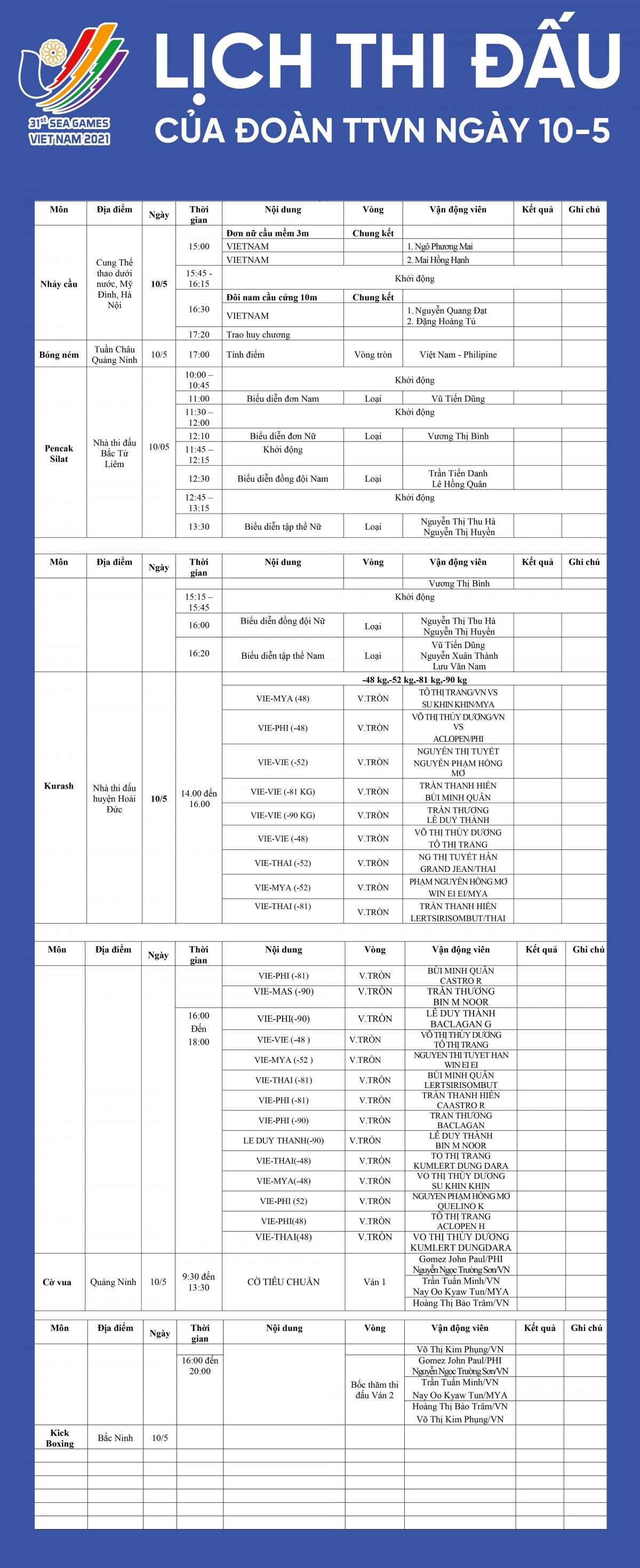 Lịch thi đấu SEA Games 31 ngày 10/5 của Đoàn Thể thao Việt Nam. Nước chủ nhà có thể sẽ giành những tấm HCV khi có VĐV thi đấu chung kết nhảy cầu. Bóng ném bãi biển nếu thắng Philippines cũng giành HCV.