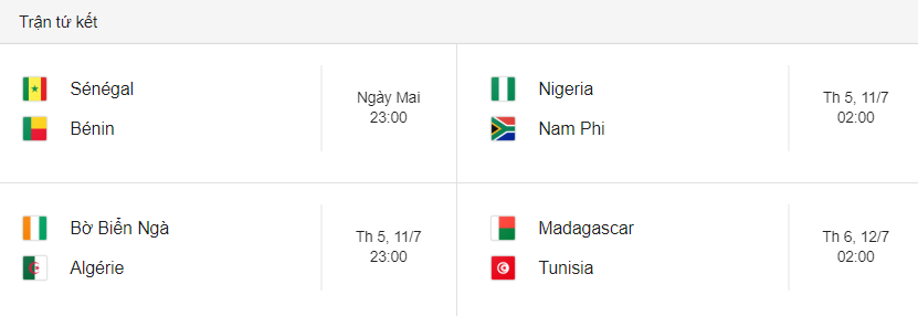 Một đội tuyển cũng được đánh giá rất cao ở giải đấu lần này là Nigeria sẽ so tài với Nam Phi. Ở cặp đấu cuối cùng, trong lần đầu tiên góp mặt ở vòng tứ kết, Madagascar sẽ chạm trán Tunisia.