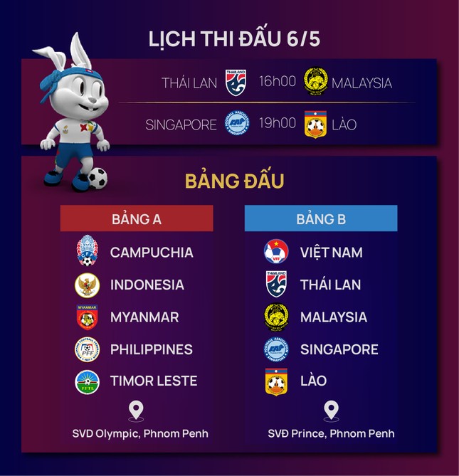06/05/2023 13:18Lịch thi đấu và trực tiếp bóng đá nam SEA Games 32 ngày 6/5: Thái Lan đại chiến Malaysia
