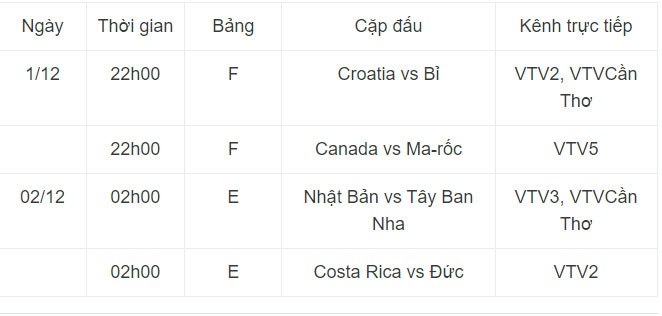 01/12/2022 13:52Lịch thi đấu và trực tiếp World Cup 2022 ngày 1/12: Bỉ đối diện nguy cơ về nước