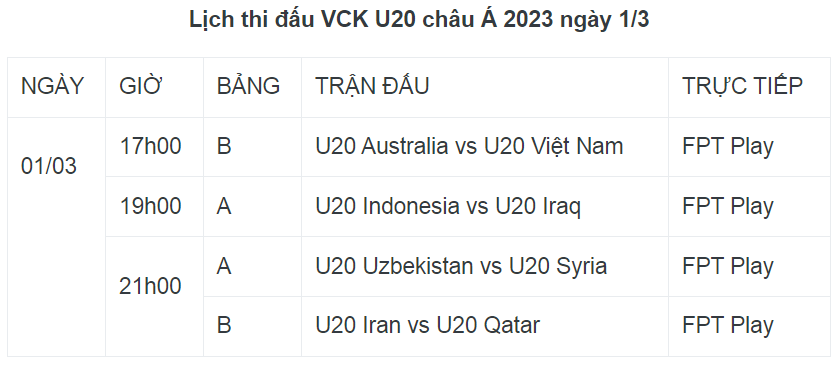 01/03/2023 14:45Lịch thi đấu VCK U20 châu Á 2023 ngày 1/3: Việt Nam xuất trận