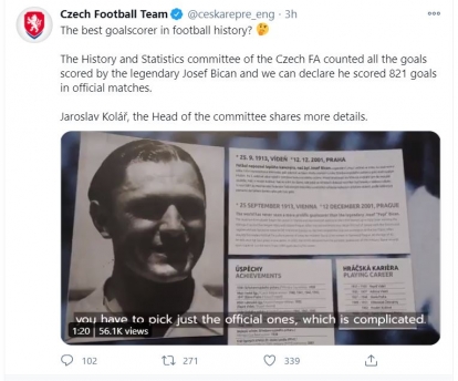"Chúng tôi đã nghiên cứu từ các nguồn dữ liệu uy tín cho thấy Josef Bican ghi 805 bàn. Tuy nhiên, con số này còn thiếu những bàn Bican ghi trong màu áo Hradec Kralove ở giải hạng Hai năm 1952. Chúng tôi xác nhận ông ấy ghi 53 bàn sau 26 trận giai đoạn này".
